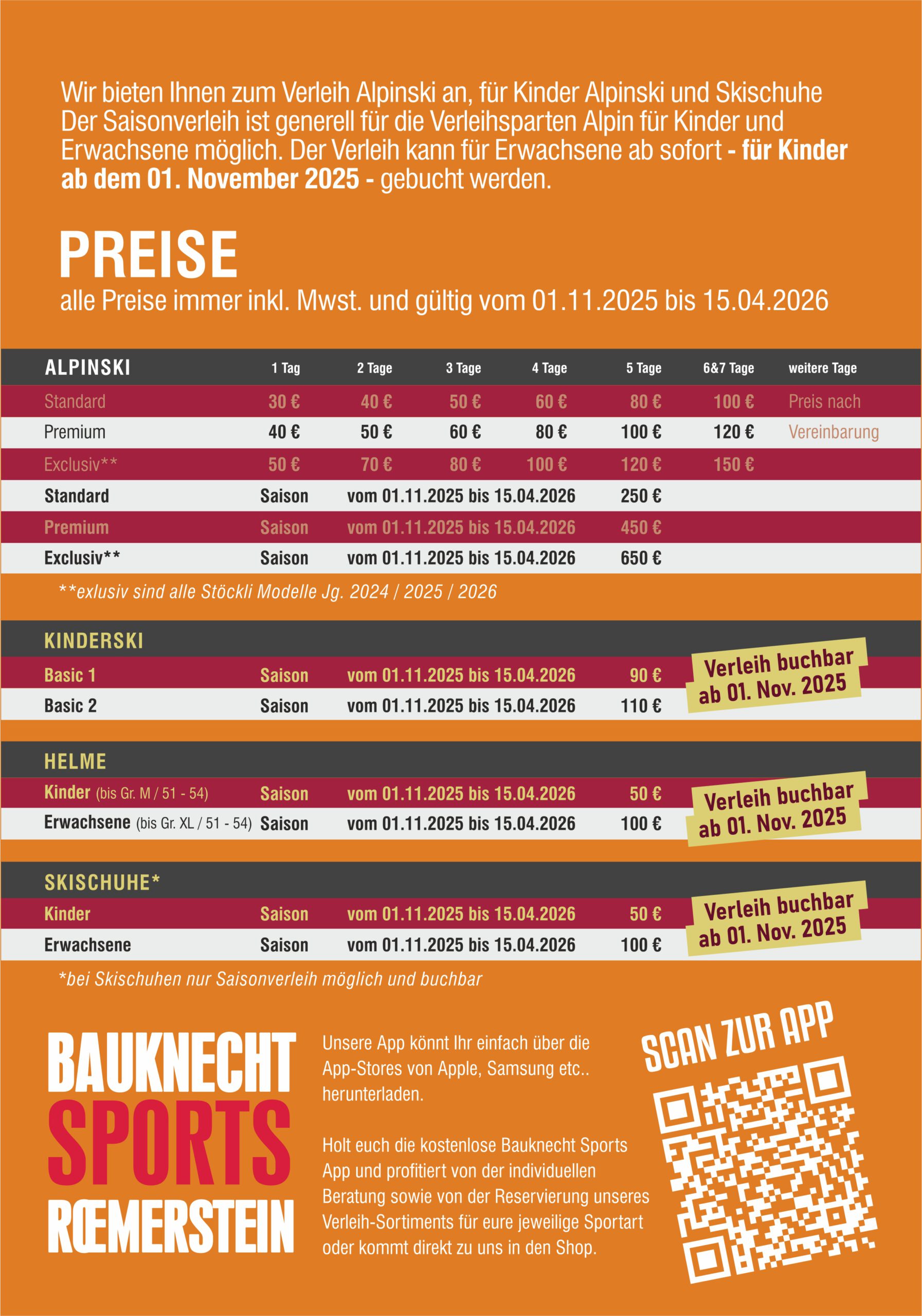 Wir bieten Ihnen Alpinski zum Verleih an. Sie haben die Möglichkeit, unsere im Shop zum Kauf angebotenen Alpinsk zu testen. Ein Saisonverleih ist generell für alle Kinder möglich. Unsere Bauknecht Sports App könnt Ihr einfach über die App-Stores von Apple, Samsung etc.... herunterladen. Holt euch jetzt die kostenlose Bauknecht Sports App und profitiert von der individuellen Beratung und von der Reservierung unseres Verleih-Sortiments oder kommt direkt zu uns in den Shop.